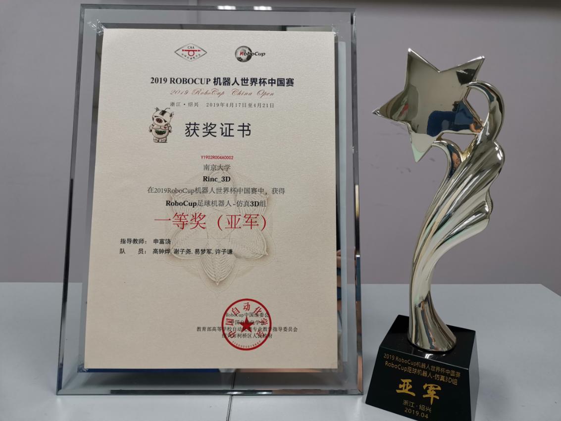 2019年4月18日-21日,2019 RoboCup机器人世界杯中国赛在浙江绍兴柯桥中国轻纺城国际会展中心举行。经过三天的激烈角逐,我系机器人智能与神经计算研究组(//blhmanhua.com/rinc/index.html)的“Rinc_3D”团队(成员:高钟烨,谢子尧,易梦军,许子谦指导教师:申富饶)荣获仿真3D组一等奖(亚军)。