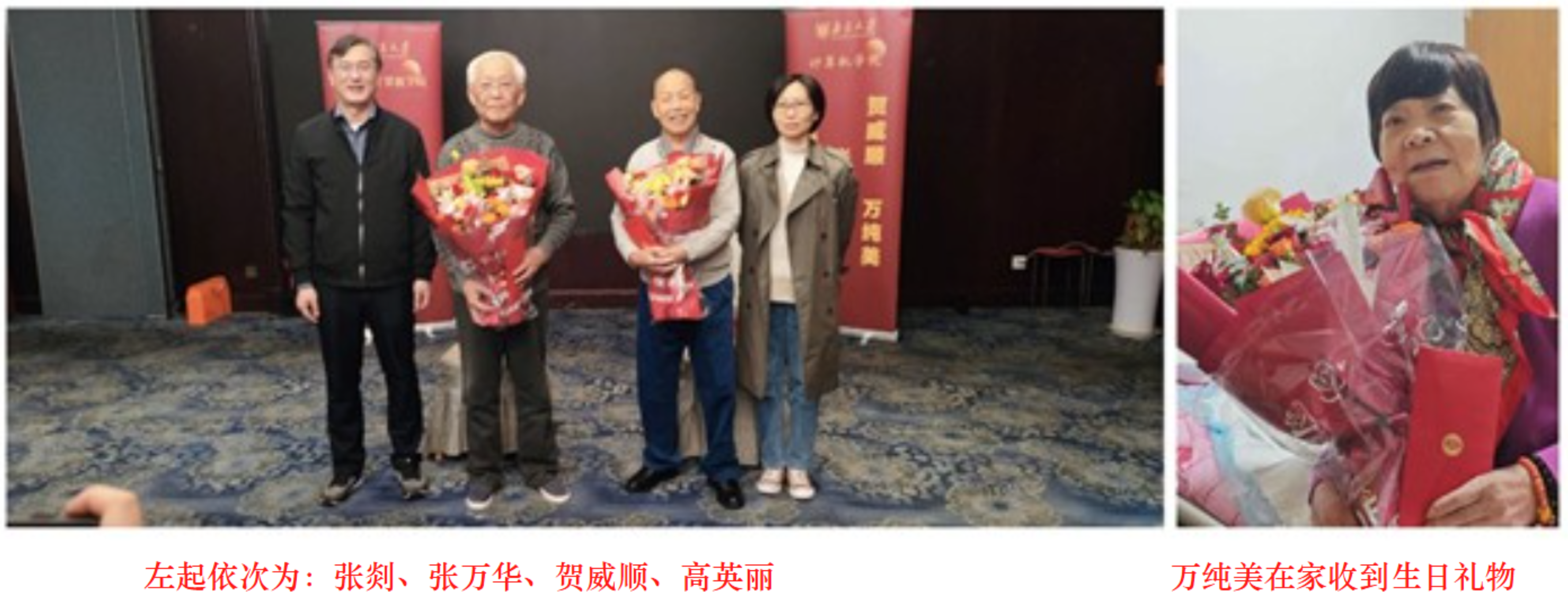 金秋十月精神爽,丹桂飘香人寿增。今年,blh漫画 又有两位老教师迈入90 高寿的行列,他们是:贺威顺和万纯美;另外,张万华今年已达80高龄。借举办重阳节敬老恳谈会的机会同时为他们三位老同志举行了简洁而不失隆重的集体祝寿仪式。院党委书记在致辞中表达了对他们的祝贺和赞誉,赞扬这三位老同志在南大工作几十载,他们爱党爱国,热爱高等教育事业,在教学服务岗位上辛勤耕耘,默默奉献,工作兢兢业业,认认真真,在南大计算机学科的创建和发展过程中都作出了重要贡献。万纯美老师因身体抱恙,未能亲临会场,同样对她表示祝福,祝愿她早日康复。学院副院长张剡为三位寿星呈送祝院领导的祝寿词和祝寿金红包,院党委秘书高英丽老师为他们献上鲜花,呈上幸福的果篮。并恭祝老寿星们生日快乐,祝你们福如东海长流水,寿比南山不老松!到场的二位寿星代表都发表了即兴感言,简要回顾了在南大学习工作和成长的经历,一致表达了对院领导和出席老同志的谢意。