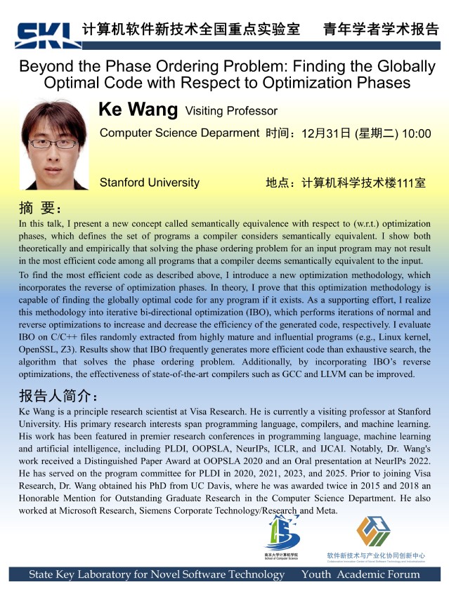 2024年12月31日 “软件新技术讲坛” 学术报告 - Ke Wang Visiting Professor