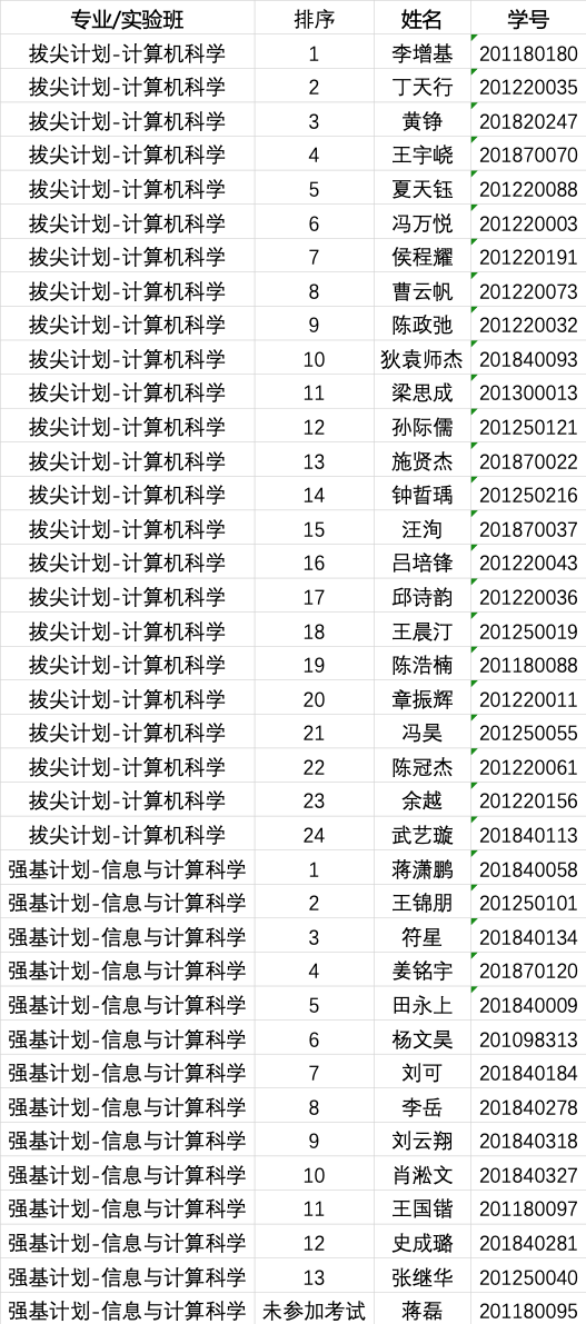 根据blh漫画 2020级本科生二次选拔方案,进入拔尖计划(计算机)/强基计划(信息与计算科学)复试考核的学生最终成绩排序公布如下,其中,拔尖计划(计算机)排序前20名、强基计划(信息与计算科学)排序前13的学生拟进入预录取名单。请进入拟录取名单的同学于9月15日17点前至计算机系楼附楼541马骏老师处签订确认书。最终预录取名单以学校公布为准。