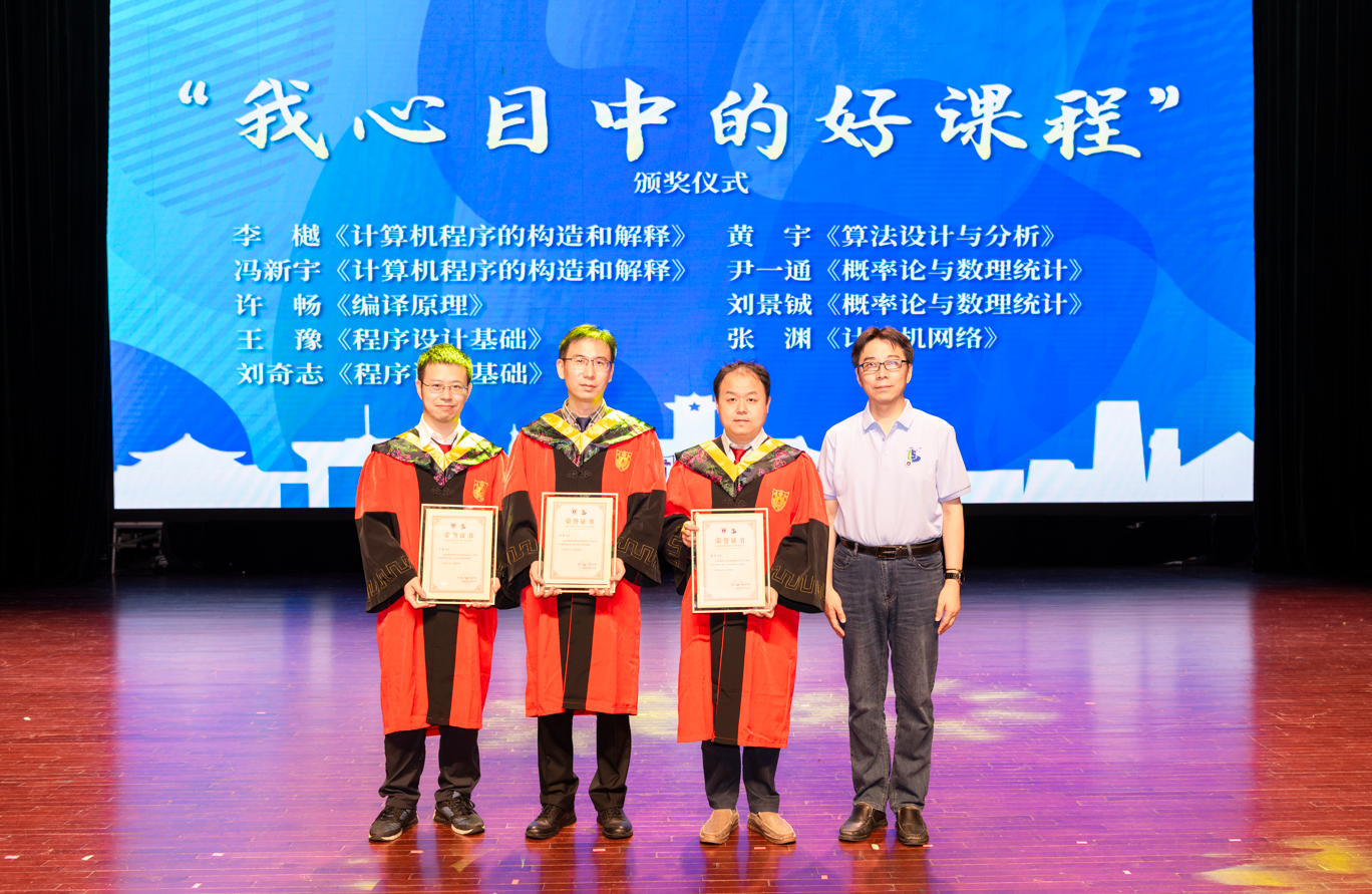 在毕业启程之际,2025届本科毕业生积极参与“我心目中的好课程”评选活动,根据投票结果产生了深受同学们欢迎的优质课程和优秀授课教师。获奖课程与教师名单如下:李樾老师和冯新宇老师《计算机程序的构造和解释》、许畅老师《编译原理》、王豫老师和刘奇志老师《程序设计基础》、黄宇老师《算法设计与分析》、尹一通老师和刘景铖老师《概率论与数理统计》、张渊老师《计算机网络》。blh漫画 软件学院人工智能学院党委书记武港山老师为获奖课程和获奖老师代表颁奖。