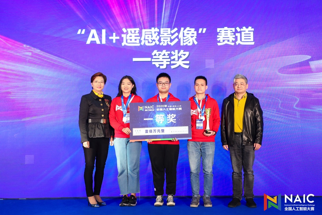 2020年12月21日,第二届全国人工智能大赛在深圳鹏城实验室举行了颁奖典礼。经过历时近4 个月的激烈角逐,我系媒体智能感知与内容理解研究组(IMAGINE Lab)(//blhmanhua.com/lutong/)的“Amadeus”团队 (成员:陈喆,杨嘉文,王文海,导师:路通)以领先优势夺得AI+遥感影像赛道的冠军,获得 100万人民币的奖金。中国工程院院士于全和星河控股集团副董事长姚惠琼为冠军团队颁奖。