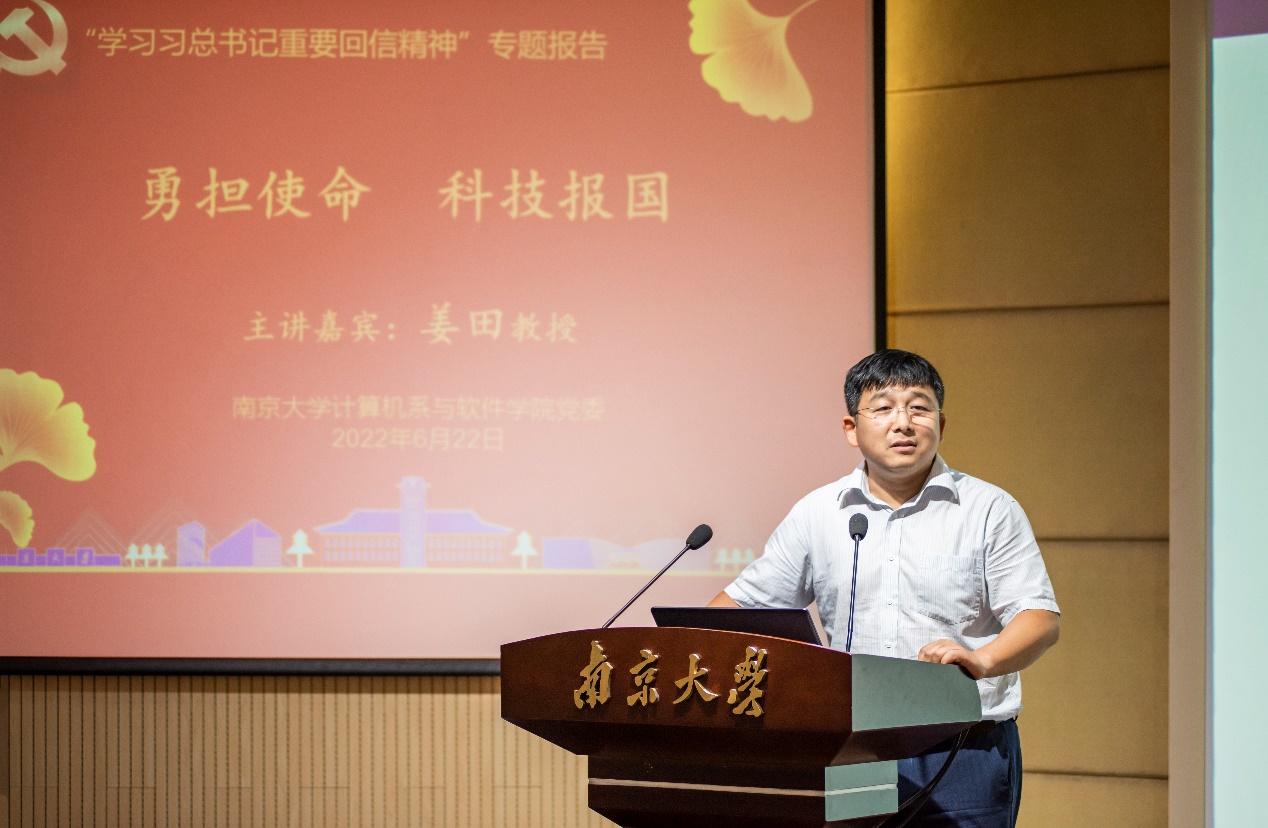 2022年6月22日下午,计算机系与软件学院党委邀请blh漫画 学习宣传习近平总书记重要回信精神专题宣讲团成员、科技处处长、电子科学与工程学院姜田教授,为全体师生党员、教职工讲授专题报告“勇担使命,科技报国”。计算机系与软件学院党委书记武港山主持会议。