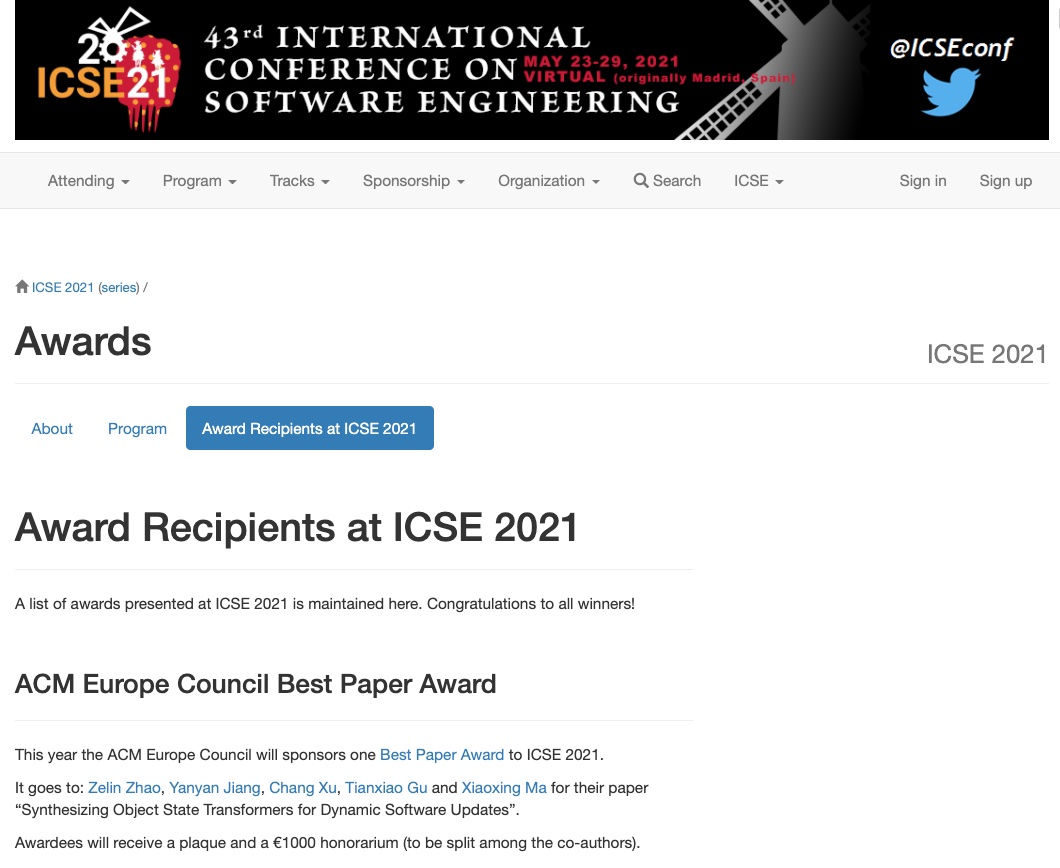 ICSE是软件工程领域的旗舰会议,也是中国计算机学会推荐A类国际学术会议,迄今已举办43届。通常,每年该会选择少于10%的录用论文授予杰出论文奖,今年额外从中遴选出唯一的最佳论文奖。此次获得杰出论文和最佳论文双奖的工作由南大软件所团队独立完成。论文作者为赵泽林博士生、蒋炎岩博士、许畅教授、顾天晓博士(现任阿里巴巴JVM高级工程师)和马晓星教授。蒋炎岩和许畅设计了本文的核心技术方案,顾天晓在软件所攻读博士学位时部分参与了此项工作。