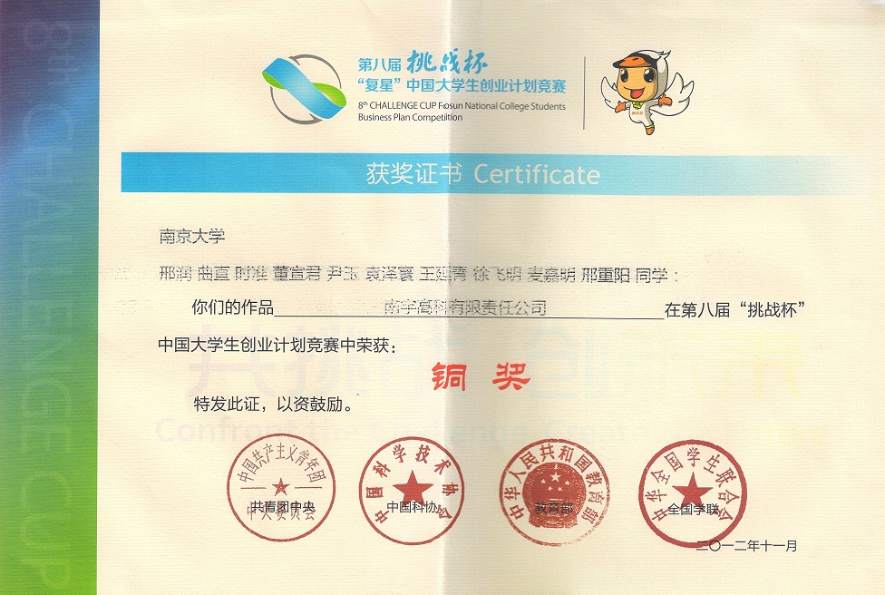 6. As the supervisor, my innovation team respectively won the Bronze Prize of the Seventh "Colledge Cup" and the Golden Prize of the Eighth "Colledge Cup" of Chinese College Students of Academic Science and Technology at China and Jiangsu Province, which is the highest level contest for graduate and undergraduate students in China, 2012
